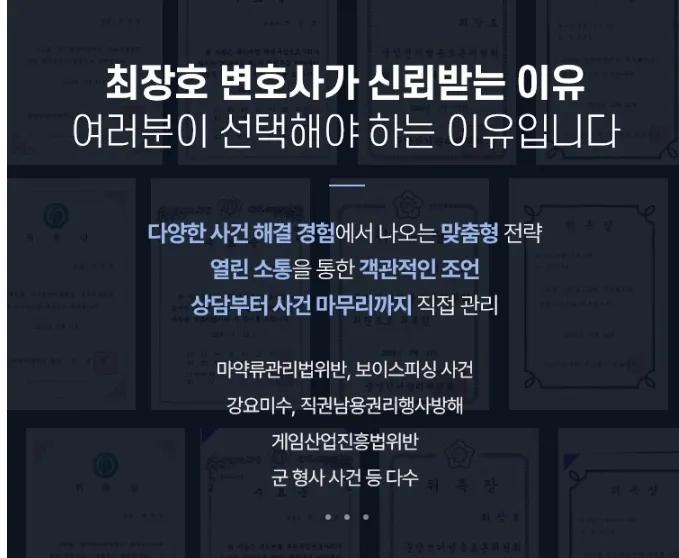 최장호 변호사는 대한변호사협회 등록 형사법 전문변호사로, 채널A 기자 ‘강요미수’사건 변호인(무죄), 공군 성추행 피해 부사관 사망 사건 공군본부 장교 변호인 (무죄), 전세 사기, 공인중개사법위반, 도로교통법위반, 보이스피싱 사건, 마약류관리법위반, 군형사 사건 등 여러 사건을 성공적으로 해결한 경험을 가지고 있습니다. 상담부터 사건 마무리까지 모두 직접 관리하고 있으니 도움이 필요하신 분들은 언제든 연락주시기 바랍니다.