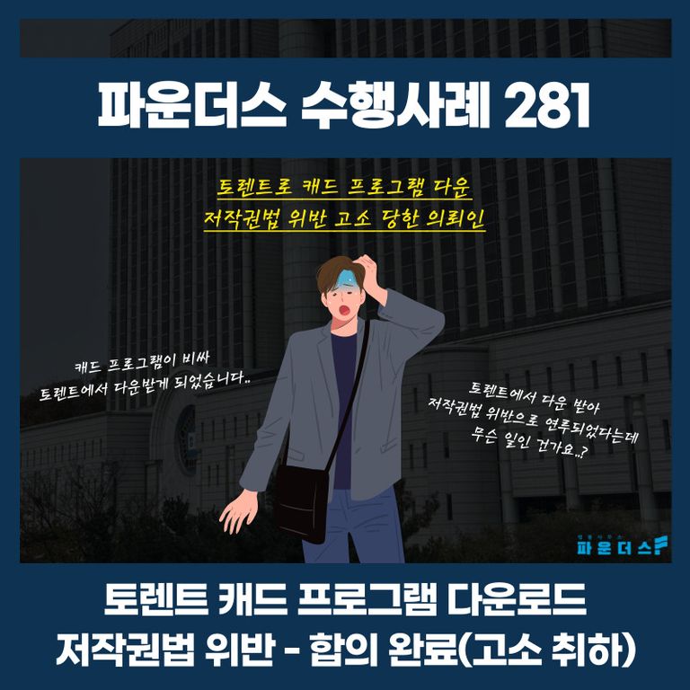 결과적으로 의뢰인은 토렌트에서 캐드(CAD) 프로그램을 불법다운하여 저작권법 위반으로 문제가 된 사건에서 원만한 합의에 이르러 마무리 지을 수 있었습니다.
