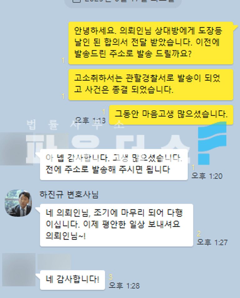 합의를 마친 변호인은 합의서 작성까지 도움을 드렸으며 고소취하서가 관할경찰서로 발송된 부분을 확인하여 끝까지 성실한 조력을 드렸습니다.