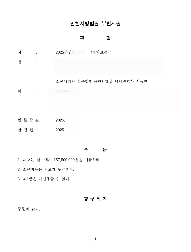 저는 즉각 민사소송 임차보증금반환청구를 하였고 법원은 원고 승소 판결을 선고하여 확정 후 경매 등 강제집행으로 의뢰인은 임차보증금을 반환받았습니다.