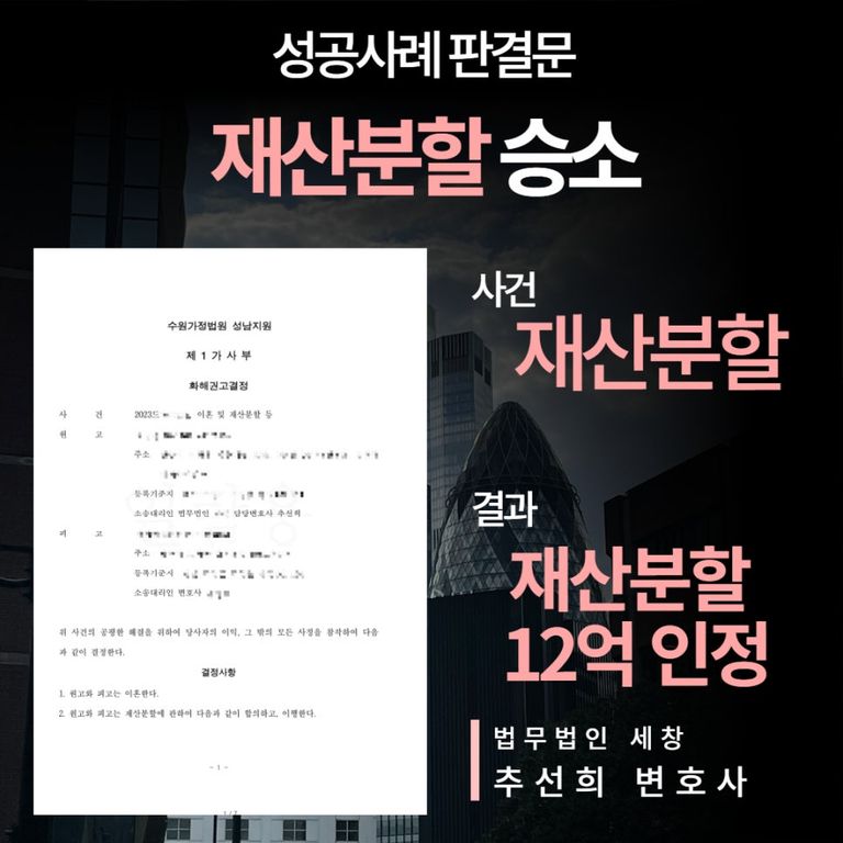 오늘 말씀드릴 사건은 혼인 기간 동안 가사와 육아에 헌신한 의뢰인이 배우자와의 재산분할 소송에서 12억 원이라는 의미 있는 결과를 이끌어낸 사례입니다.