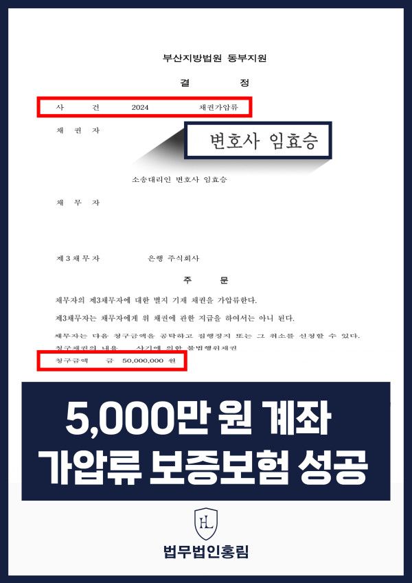 그 결과 법원에서는 본 변호인의 주장을 받아들여 5,000만 원 통장 가압류(전액 보증보험)하였습니다.
