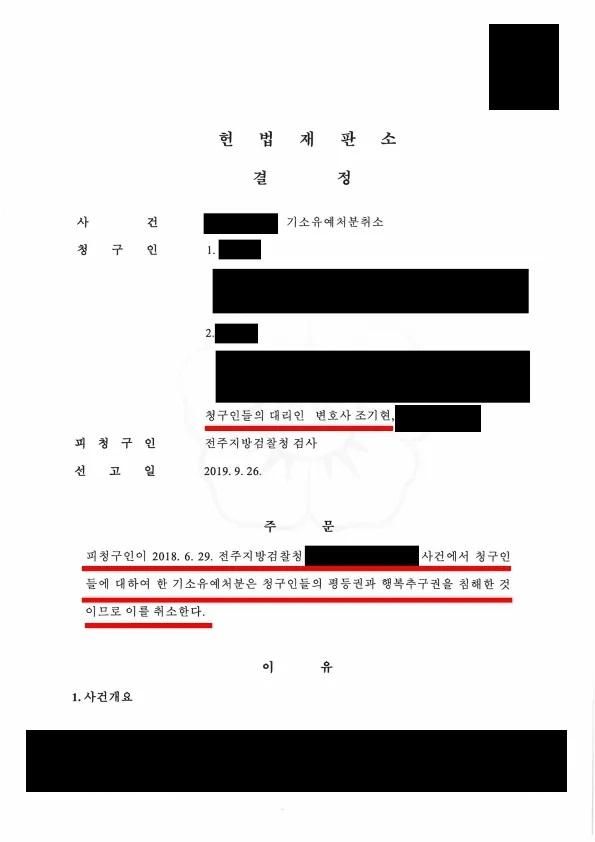 헌법재판소는 조기현 변호사의 주장을 받아들여 의뢰인 부부에게 내려진 검사의 기소유예처분을 취소하는 결정을 하였습니다.