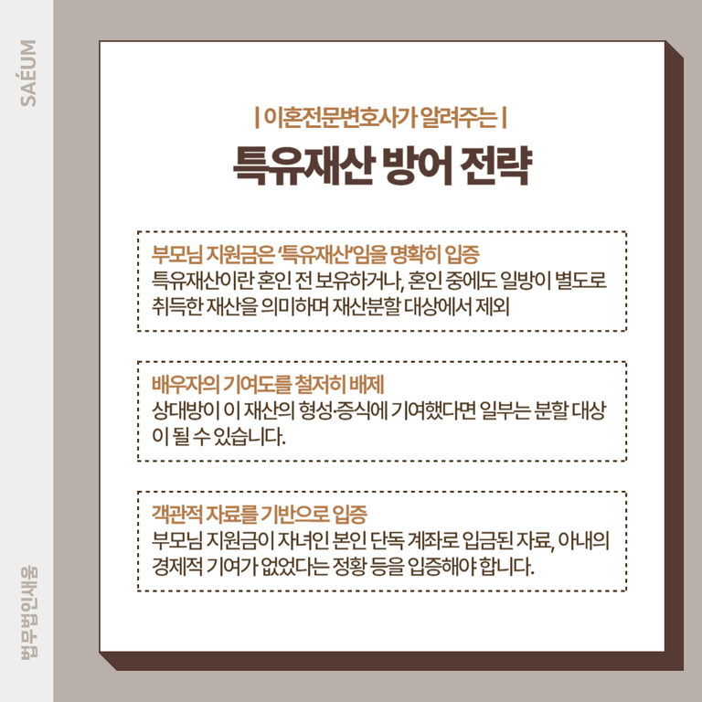 1⃣ 부모님 지원금은 ‘특유재산’임을 명확히 입증했습니다. 특유재산이란 혼인 전 보유하거나, 혼인 중에도 일방이 별도로 취득한 재산을 의미하며 재산분할 대상에서 제외될 수 있습니다.