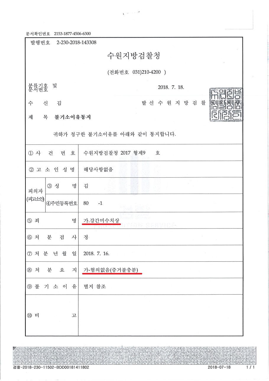 3. 검찰의 강간미수치상 무혐의 처분 통지서
