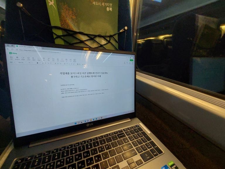 아무도 없는 KTX에서 혼자 글을 쓰고 있습니다.