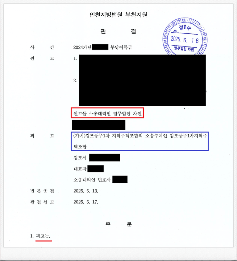 그러나, 가입 후 피고 김포풍무1차 지역주택조합 측이 진행하는 사업이 계획대로 진행되지 않았고, 이에 의뢰인들은 정식 민사소송을 통하여 기 납입한 각 금원의 반환을 원하였습니다.