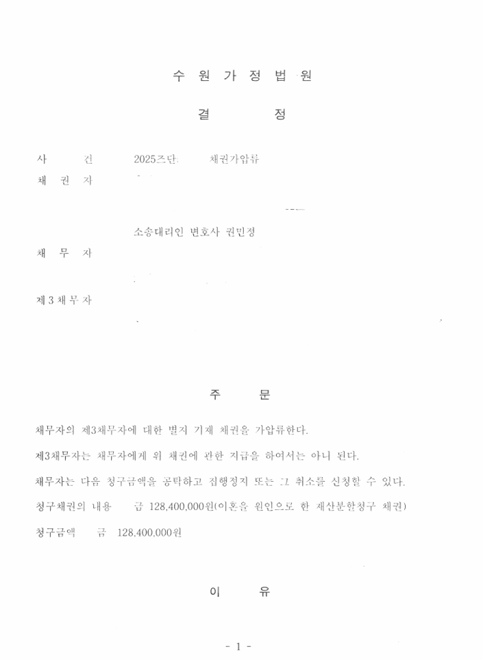 위 사안은 의뢰인이 이혼소송으로 1.3억 가량을 재산분할로 청구한 사안이었습니다. 도중 상대방의 은닉 방지를 위해 추가적으로 가압류 신청을 의뢰하셨는데요.