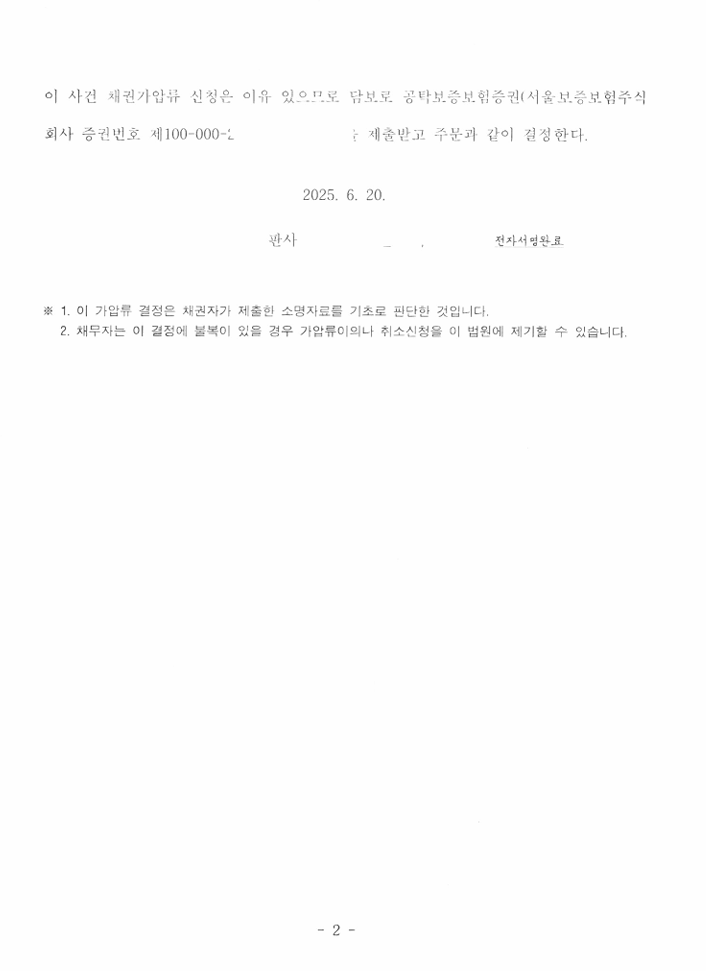 그 결과 담당 재판부는 신청 금액 그대로 가압류 결정을 하면서 의뢰인이 지급해야 하는 공탁금 역시 보증보험증권으로 갈음하게 해주어 사실상 면제결정을 해주었습니다.