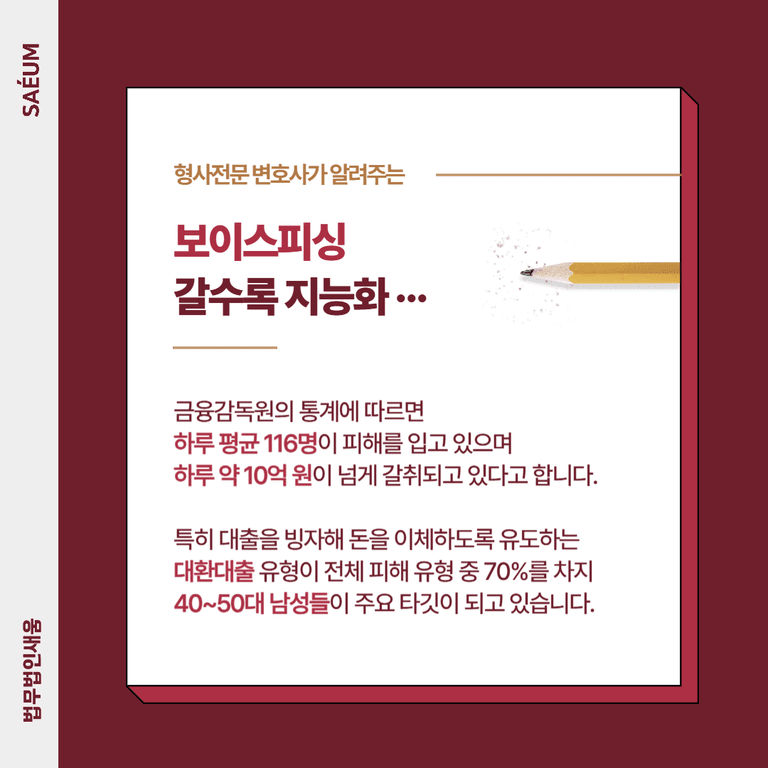 최근 보이스피싱 범죄는 갈수록 지능화되고 있습니다. 금융감독원의 통계에 따르면 하루 평균 116명이 피해를 입고 있으며, 이로 인해 하루 약 10억 원이 넘는 자금이 갈취되고 있다고 합니다. 특히 대출을 빙자해 돈을 이체하도록 유도하는 ‘대환대출’ 유형이 전체 피해 유형 중 70%를 차지하고 있으며, 40~50대 남성들이 주요 타깃이 되고 있습니다.