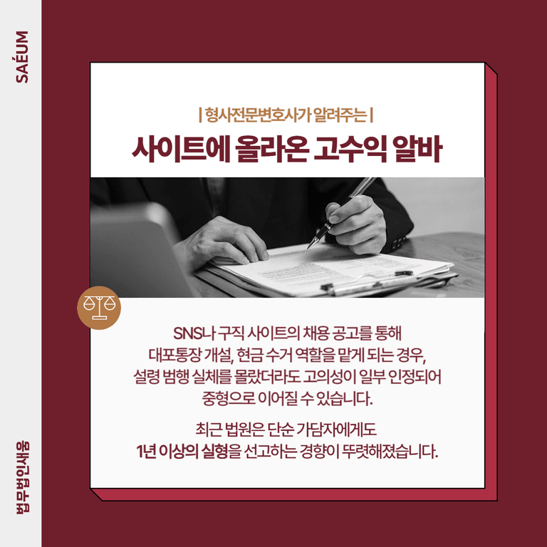 SNS나 구직 사이트를 통해 접한 단순 금융지원 업무. 대포통장을 개설하거나, 현금 수거 역할을 맡게 된 분들 중에는 ‘정식 아르바이트’로 착각한 경우가 적지 않습니다. 그러나 실제로는 보이스피싱 조직에 가담한 것으로 간주되어 형사처벌을 받을 수 있습니다.