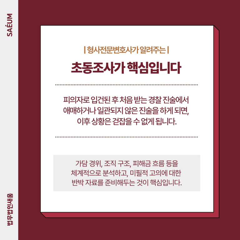 피의자로 입건된 후 처음 받는 경찰 진술에서 애매하거나 일관되지 않은 진술을 하게 되면, 이후 상황은 걷잡을 수 없게 됩니다. 따라서 처음부터 변호인의 조력을 받아 전략적인 진술 방향을 잡는 것이 중요합니다.