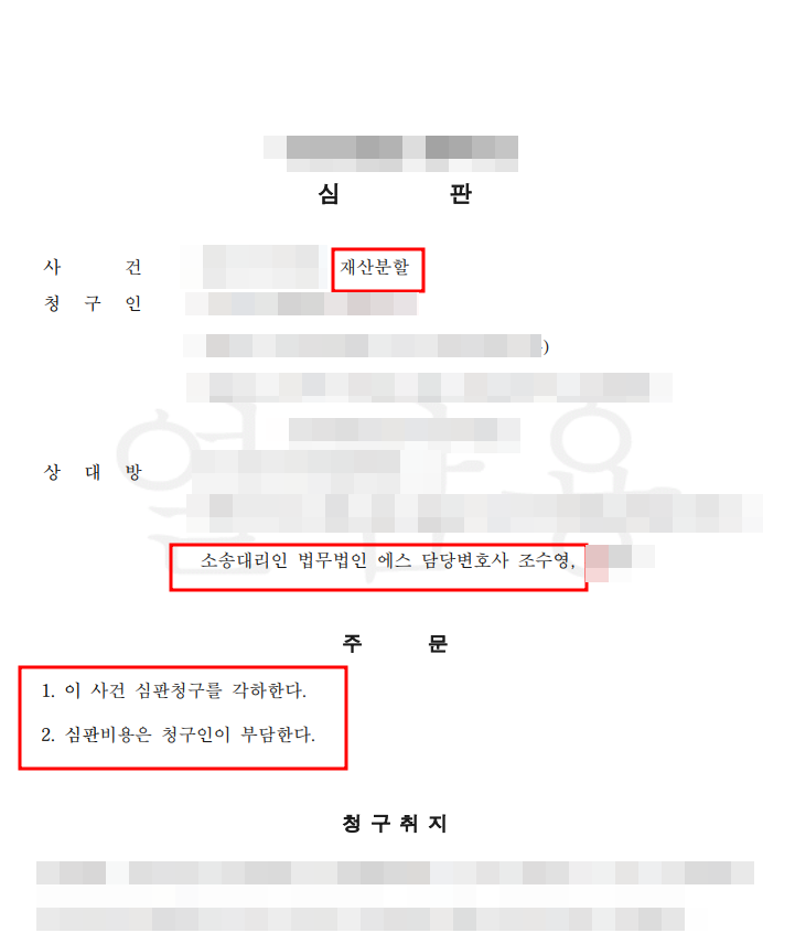 그 결과 법원에서도 저희 측 주장을 모두 받아들였고, 남편의 재산분할청구에 대해서 각하 판결이 내려졌습니다.
