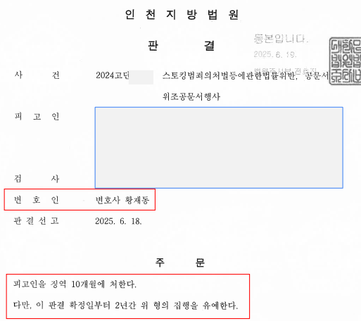 최근(25. 6. 18.) 인천지방법원에서 스토킹범죄의처벌등에관한법률위반, 공문서위조죄, 위조공문서행사죄로 기소된 피고인(의뢰인)에 대해 집행유예 판결을 선고받았습니다.