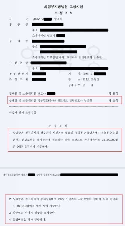 조정 과정에서 1시간 가까이 상대방과 치열하게 협의했고, 최종적으로 합리적인 조정안을 도출할 수 있었습니다. 특히 자녀 명의로 된 청약통장과 적금을 해지하기 위해 공동친권자인 전 남편의 협조 조항을 조정조서에 명시하는 데 성공했습니다.