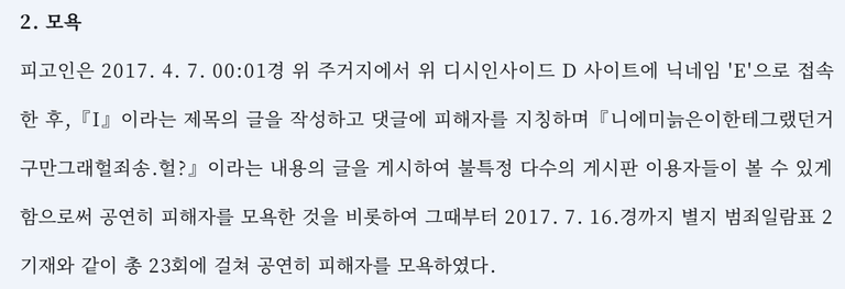 그럼 실제 사례를 살펴보겠는데요, 이 사건은 디시인사이드에서 발생한 모욕죄와 명예훼손죄, 그리고 협박죄에 대한 것입니다. 피고인은 인터넷 상에서 특정 닉네임을 사용해 다른 사용자를 대상으로 모욕적인 발언과 협박, 그리고 거짓 정보를 퍼뜨려 피해자의 명예를 심각하게 훼손했습니다. 특히, 피고인은 피해자에 대한 개인적인 불만을 인터넷 상에 공개적으로 표출하여 피해자를 비방하고, 거짓된 사실을 유포함으로써 피해자의 사회적 평판을 저하시켰습니다.