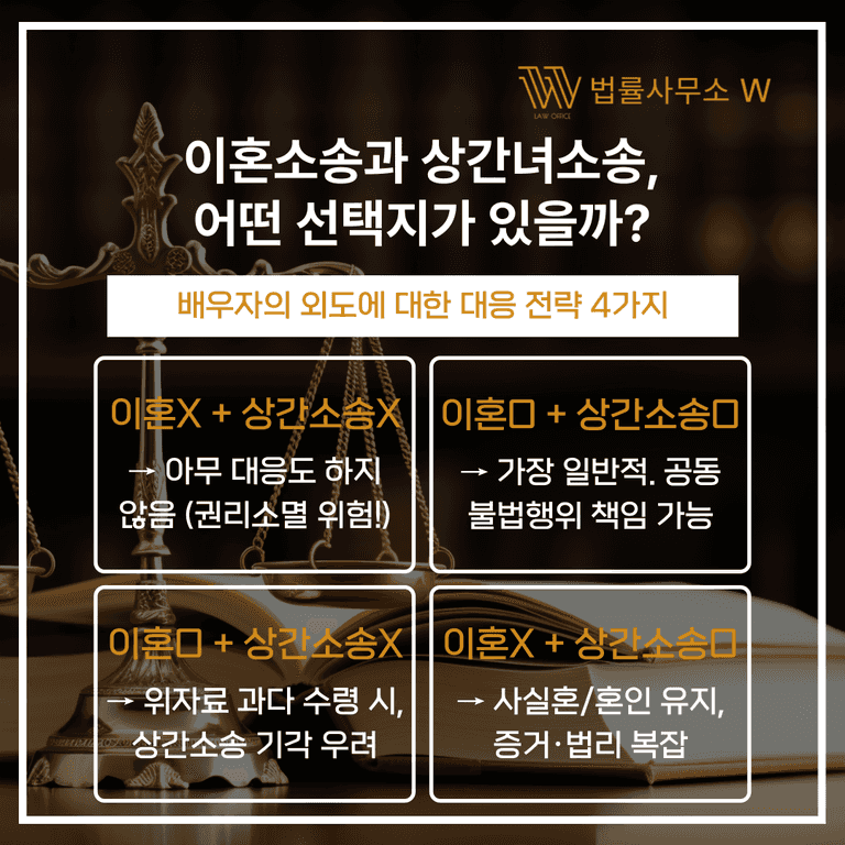 이혼만 하고 상간녀소송은 안 함: 남편으로부터 위자료를 받고 사건을 마무리하는 전략입니다. 다만 추후 상간녀소송을 하려면 위자료 중복을 피해야 하므로 신중하게 접근해야 합니다.