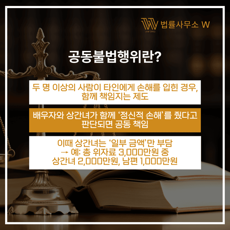 이혼 후 상간녀소송: 두 사건을 동시에 진행해 배우자와 상간녀를 공동책임자로 만들 수 있습니다. 이때는 ‘공동불법행위’ 원칙이 적용됩니다.