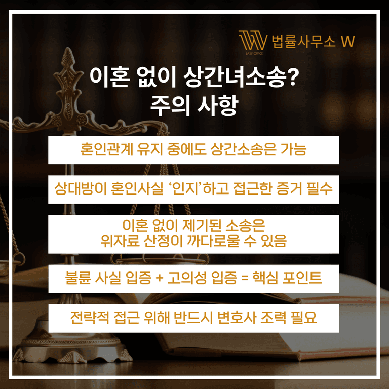 이혼 없이 상간녀소송만 제기: 이 경우는 상간녀가 혼인 사실을 알고 있었는지 여부가 핵심 쟁점이며, 법률전문가의 전략적 접근이 필요합니다.