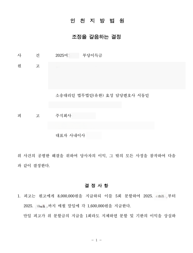 저는 즉각 입금 받은 자를 피고로 하여 민사소송 부당이득반환청구소송을 제기하였고 법원은 일부 감액된 금액을 피고가 지급하는 내용의 강제조정을 내려 확정되어 의뢰인은 피해액을 반환받았습니다.