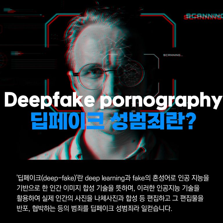 '딥페이크(deep-fake)'란 deep learning과 fake의 혼성어로 인공 지능을 기반으로 한 인간 이미지 합성 기술을 뜻하며, 이러한 인공지능 기술을 활용하여 실제 인간의 사진을 나체사진과 합성 등 편집하고 그 편집물을 반포, 협박하는 등의 범죄를 딥페이크 성범죄라 일컫습니다.