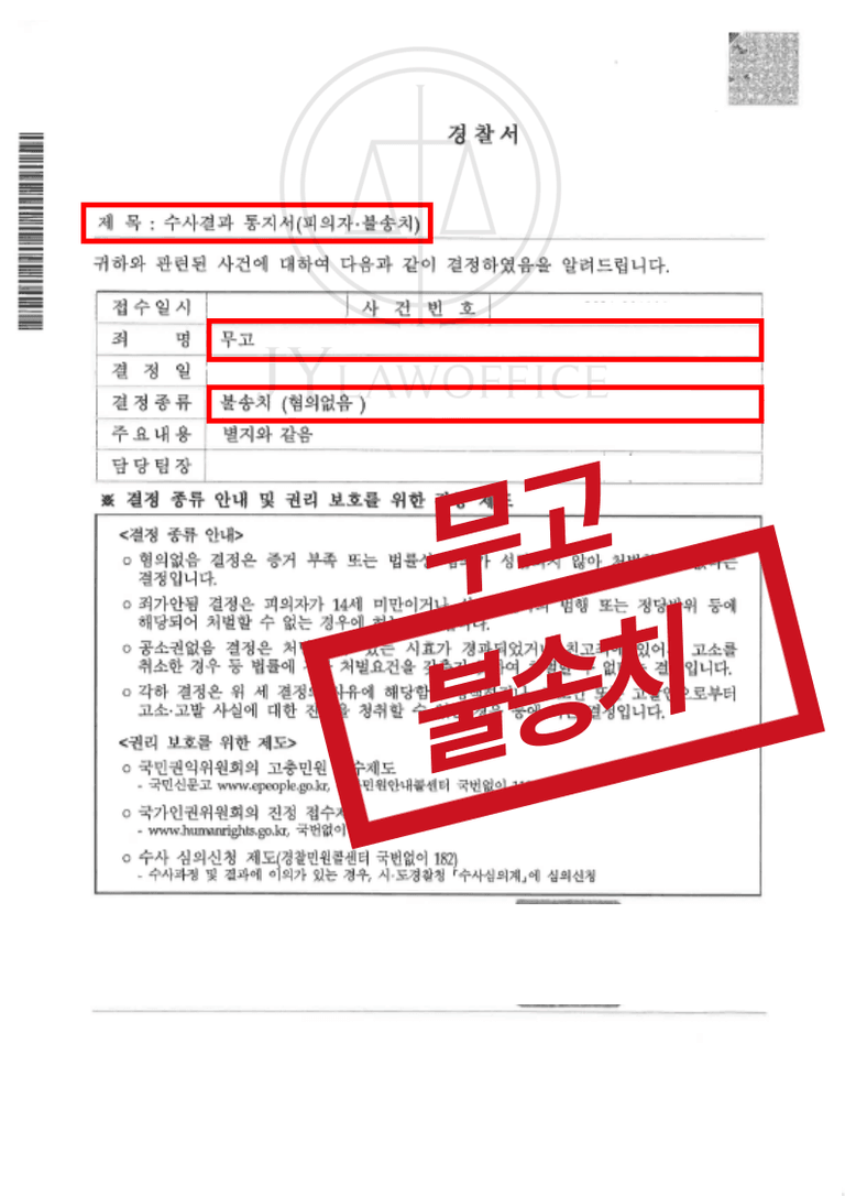 이와 같은 본 형사전문변호사의 조력으로 의뢰인은 무고 혐의에 대해 불송치(혐의 없음)의 결정을 받고 경찰단계에서 형사 처벌을 피하며 무사히 사건을 종결시킬 수 있었습니다.