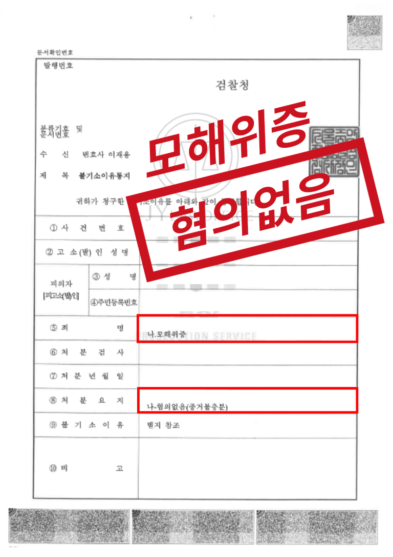 이와 같은 본 형사전문변호사의 조력으로 의뢰인은 모해위증 혐의에 대해 혐의 없음의 불기소 처분을 받고 무사히 사건을 종결시킬 수 있었습니다.