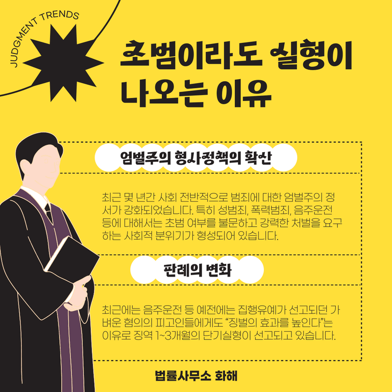 실제로 최근에는 음주운전 등 예전에는 집행유예가 선고되던 가벼운 혐의의 피고인들에게도 “징벌의 효과를 높인다”는 이유로 징역 1~3개월의 단기실형이 선고되고 있습니다. 특히 피해자가 처벌을 원할 경우 초범임에도 불구하고 실형이 선고되는 사례가 점점 늘고 있으니, 사건 발생 초기부터 신속하고 적극적으로 대응하는 것이 무엇보다 중요합니다.