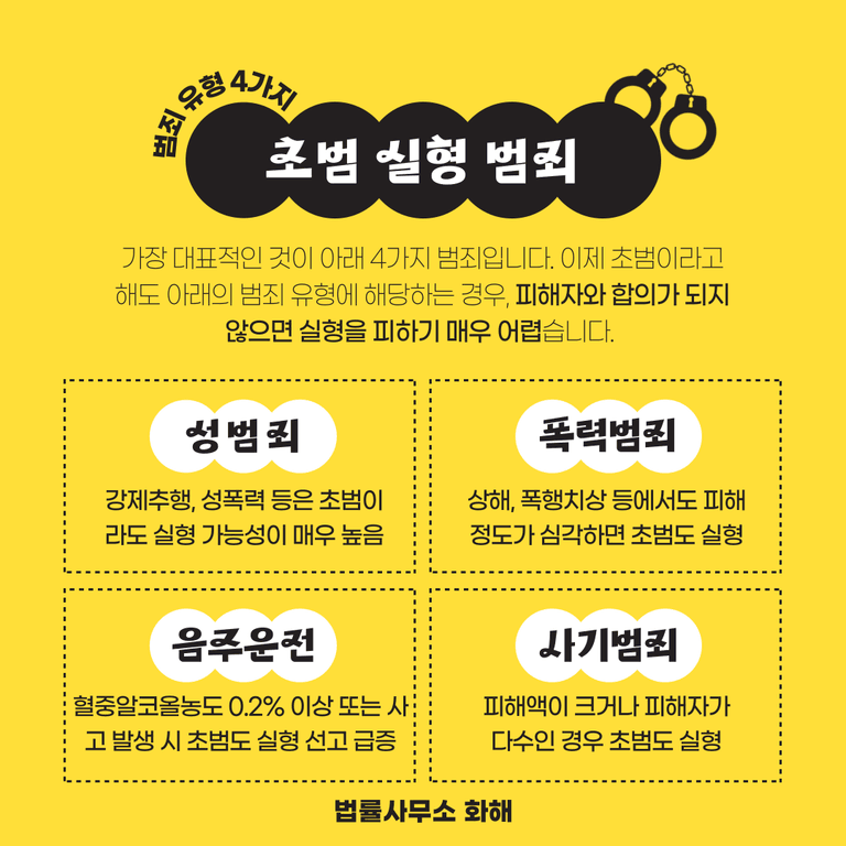 사실 과거만 해도, 초범이라면 집행유예나 선고유예 등 비교적 가벼운 처벌을 받는 경우가 많았습니다. 그러나 최근 몇 년 사이 형사처벌의 기준이 크게 바뀌었는데요. 이제는 아무리 초범이라 해도, 피해자와의 합의가 이루어지지 않는다면 단기 실형을 각오해야 하는 추세입니다.