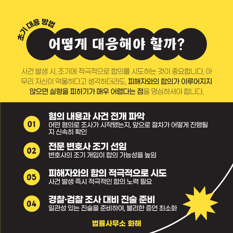 이런 상황에서 가장 현명한 대응 방법을 꼽으라면, 우선 조기에 적극적으로 합의를 시도하는 것이 핵심입니다. 아무리 자신이 억울하다고 생각하더라도, 피해자와의 합의가 이루어지지 않으면 실형을 피하기가 매우 어렵다는 점을 명심해야 합니다. 따라서 사건이 발생하면 즉시 합의에 나서야 하며, 이때 중요한 것은 합의금의 액수가 아니라 합의 그 자체인데요. 물론 적정한 수준의 합의금은 필요하지만, 그보다는 피해자의 입장을 충분히 이해하고 진정성 있는 사과를 하는 것이 더욱 중요합니다.