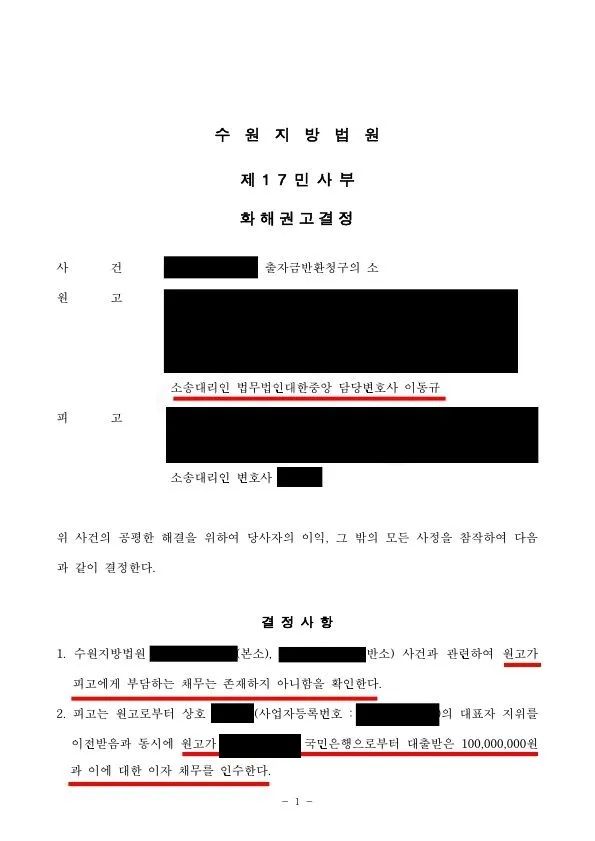 재판부는 의뢰인 A씨가 B씨에게 부담하는 채무는 존재하지 않음을 확인하고, A씨가 대출받은 1억 원과 그 이자 채무(약 1억 1천만 원 상당)를 인수하라는 화해권고결정을 내렸습니다. 화해권고결정이기는 하지만 B씨의 주장은 기각된 반면 의뢰인 A씨와 이동규 변호사의 주장이 대부분 받아들여진 것입니다.