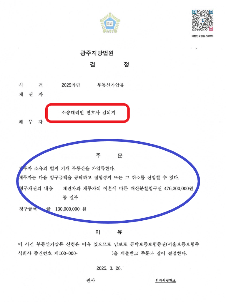 오늘은 제가 직접 수행하여 상대방 명의의 '부동산 지분'에 대해 가압류 결정을 받아낸 성공 사례를 통해, 이혼 후 재산분할금 등 채권을 확보하기 위한 부동산 지분 가압류의 중요성과 효과적인 전략에 대해 자세히 알려드리겠습니다.