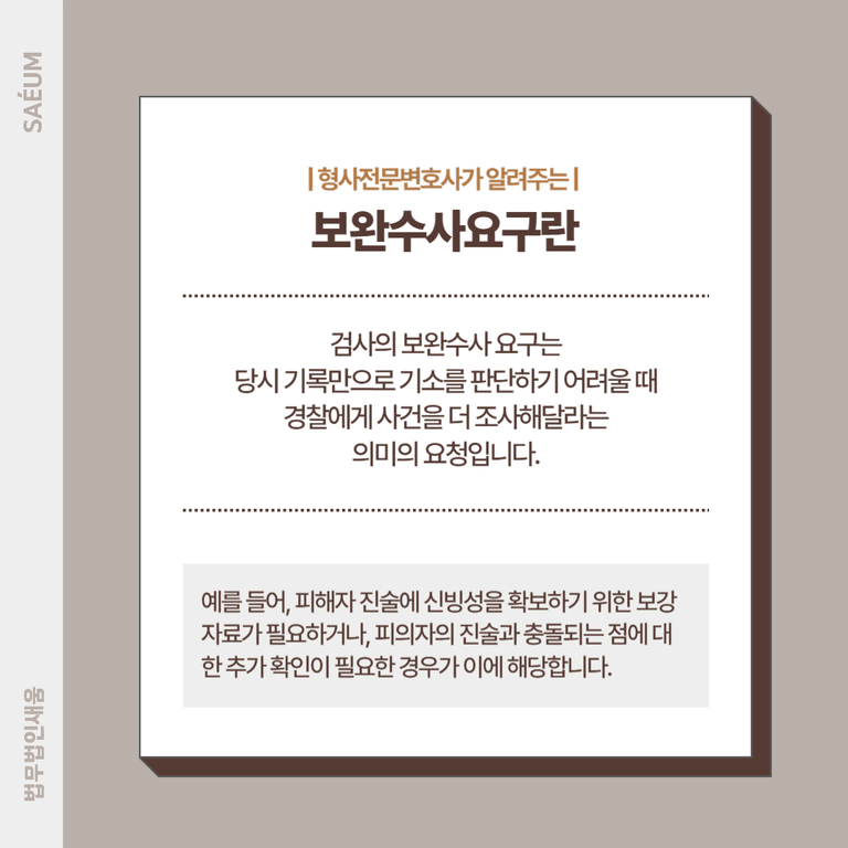 검사의 보완수사요구는 간단히 말해 ‘좀 더 자세히 들여다볼 필요가 있는 사건’이라는 의미입니다. 보통 검찰은 하루에 10건 이상, 한 달 평균 300건 이상의 사건을 검토해야 하므로, 모든 사건을 꼼꼼히 조사하는 데 한계가 있습니다.