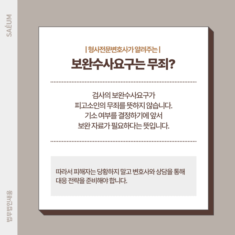 보완수사요구가 내려졌다고 해서 무죄라는 뜻은 아닙니다. 그저 검사가 기소 여부를 결정하기에 앞서 추가적인 정보나 보완자료가 필요하다는 뜻이므로, 당황하지 말고 대응 전략을 준비해야 합니다.