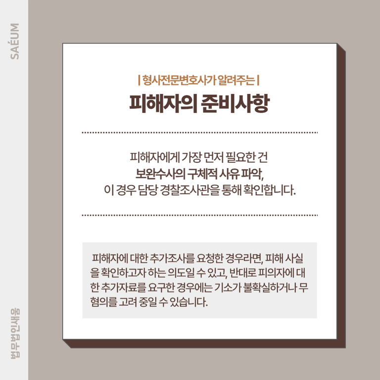 따라서 반드시 담당 수사관과의 소통을 통해 보완수사 요구의 정확한 내용과 방향을 파악하고, 피해자의 입장을 명확히 뒷받침할 수 있는 자료를 추가 제출해야 합니다.