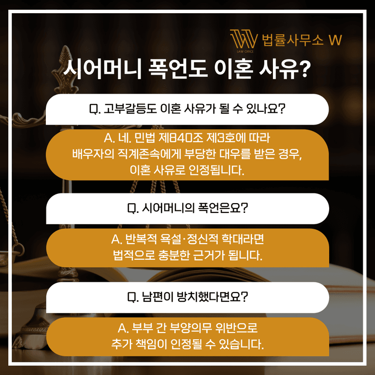 그런데 실제로는 시어머니의 지속적인 간섭이나 폭언, 무시 등도 이혼의 직접적인 원인이 될 수 있습니다.