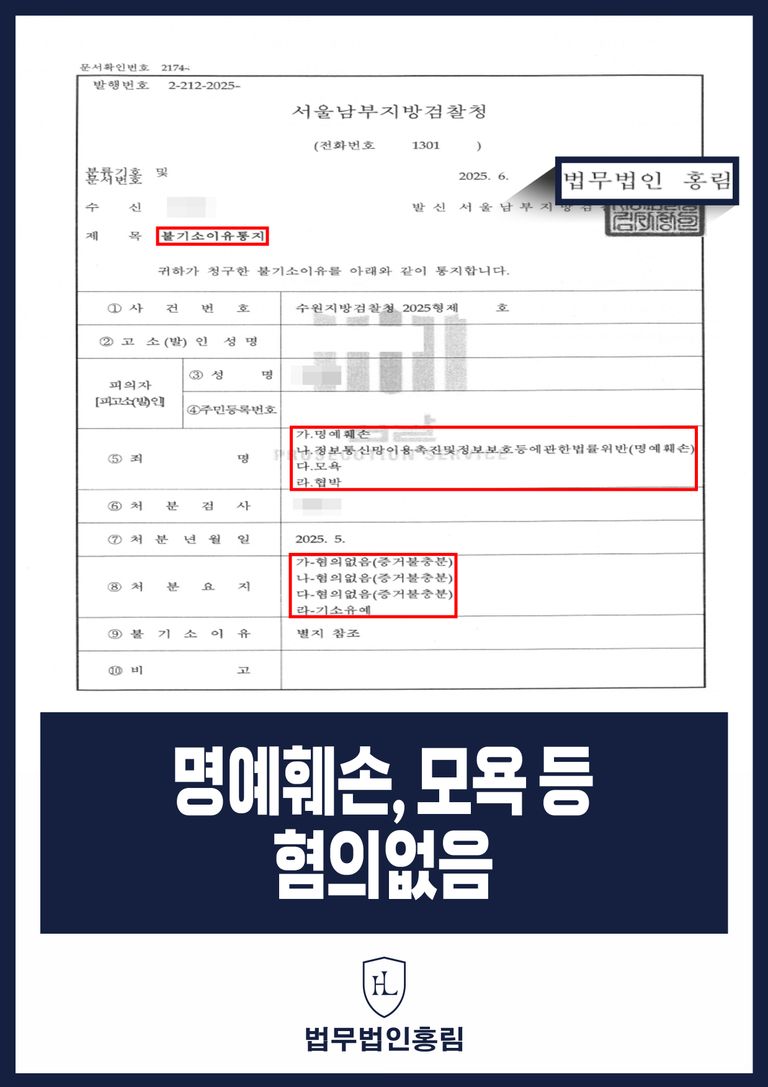 법무법인 홍림은 관련 증거로서 배우자의 카카오톡 내역, 불륜 당사자의 문자 메시지, 통화 녹취, 회사 민원 제출 내역 등 객관적인 자료를 제출하며 수사기관과 소통하였습니다. 나아가 정보통신망법상 명예훼손의 구성요건을 면밀히 분석하여 사실의 적시가 허위가 아님을 입증하였고, 모욕 혐의에 대해서도 사회 통념상 수위가 낮은 표현이라는 점을 조목조목 정리하였습니다.
