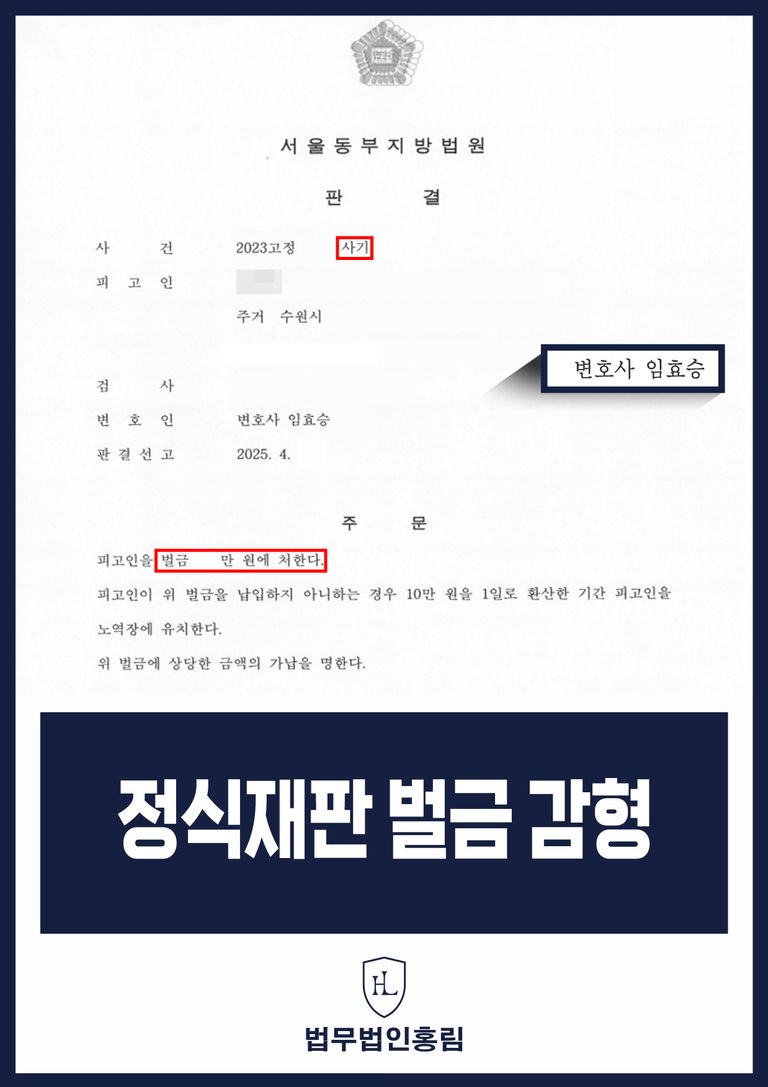 결과적으로 A씨는 정식재판을 청구함으로써 벌금 감형이라는 실질적 이익을 얻었고, 법무법인 홍림은 형사절차 전반에서 전략적 대응을 통해 사기 사건에서도 피해 회복과 벌금 감형이라는 두 가지 목표를 모두 달성하는 데 성공하였습니다.