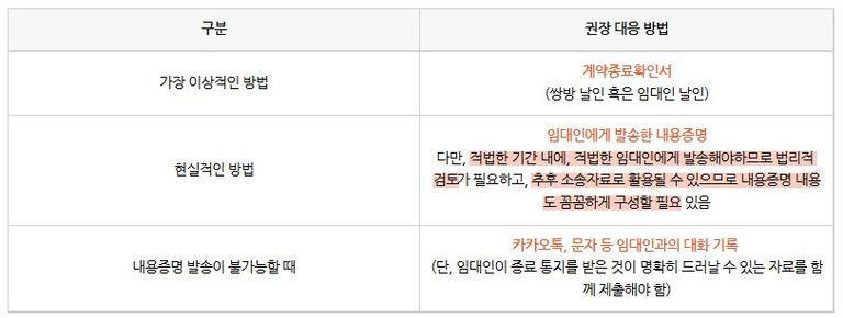 이상적인 방법은 임대인이 ‘계약 종료 확인서’와 같은 서류에 날인해주는 것입니다. 이 경우, 임대인, 임차인 모두 임대차가 끝났다는 것에 다툼의 여지가 없다는 게 명확히 드러나기 때문입니다.