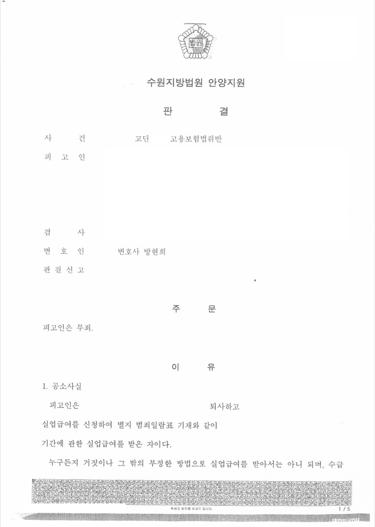 제가 담당하였던 사건 중에 피고인이 고용보험법위반으로 형사 재판을 받게 되었으나, 법원에서 무죄 판결을 선고받은 성공사례를 소개해 드리겠습니다.