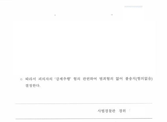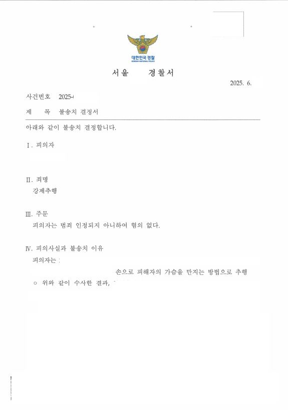 경찰은 변호인의 의견을 적극 수용하여 강제추행죄에 대해 무혐의 불송치 처분을 내렸습니다.