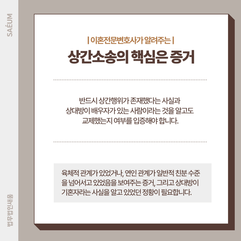 예를 들어 단순히 메시지를 주고받거나 함께 식사를 한 정도의 정황만으로는 부족합니다. 육체적 관계가 있었거나, 연인 관계가 일반적 친분 수준을 넘어서고 있었음을 보여주는 증거, 그리고 상대방이 기혼자라는 사실을 알고 있었던 정황이 함께 필요합니다.