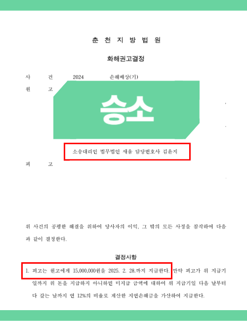 상대방이 모든 혐의를 부인하고 있음에도 불구하고, 위자료 일부 인용의 화해권고결정을 받았고 1,500만 원의 위자료를 지급받아 만족스러운 결과를 이끌어낼 수 있었습니다.