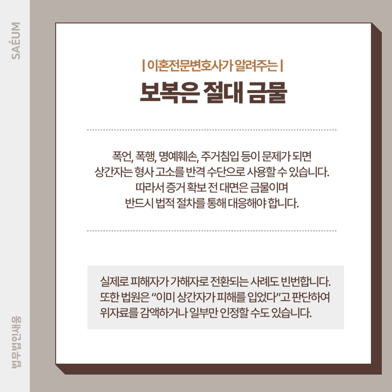 하지만 폭언, 폭행, 명예훼손, 주거침입 등이 문제가 되면, 상간자는 오히려 형사고소를 반격 수단으로 사용할 수 있습니다. 실제로 피해자가 가해자로 전환되는 사례도 빈번합니다. 또한 법원은 “이미 상간자가 피해를 입었다”고 판단하여 위자료를 감액하거나 일부만 인정할 수도 있습니다.