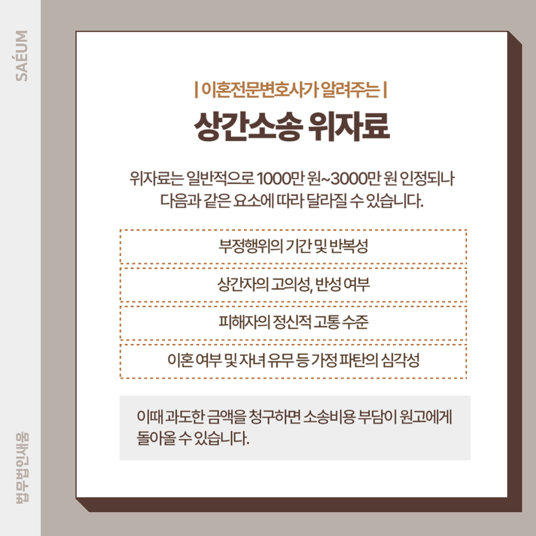 상간소송에서 위자료는 일반적으로 1,000만 원~3,000만 원 사이에서 인정됩니다.