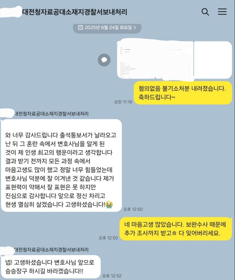 처음 대량 발생하였을 때도 무혐의가 되니 안 되니 저잣거리에 말이 많았던 것으로 기억하는데 다른 변호사의 의견은 제가 별로 관심이 없고 처음 약정하면서 말한 대로 무혐의라는 기쁜 결과를 전달해 줄 수 있었습니다.
