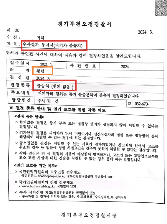 그 결과, 마침내 저희 측이 주장한 내용이 모두 인정할 만 하다는 취지로 사건 담당 경찰서에서는 의뢰인에 대해 '무혐의처분(불송치결정)'을 내려주었고(위 결정문 참고)
