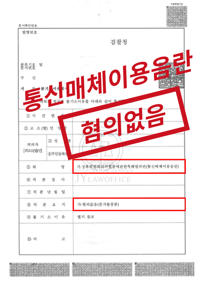 이와 같은 성범죄 전문 변호사의 조력에 따라, 의뢰인은 통신매체이용음란죄 혐의를 받았지만, 혐의 없음 의 처분을 받고 무사히 사건을 종결시킬 수 있었습니다.