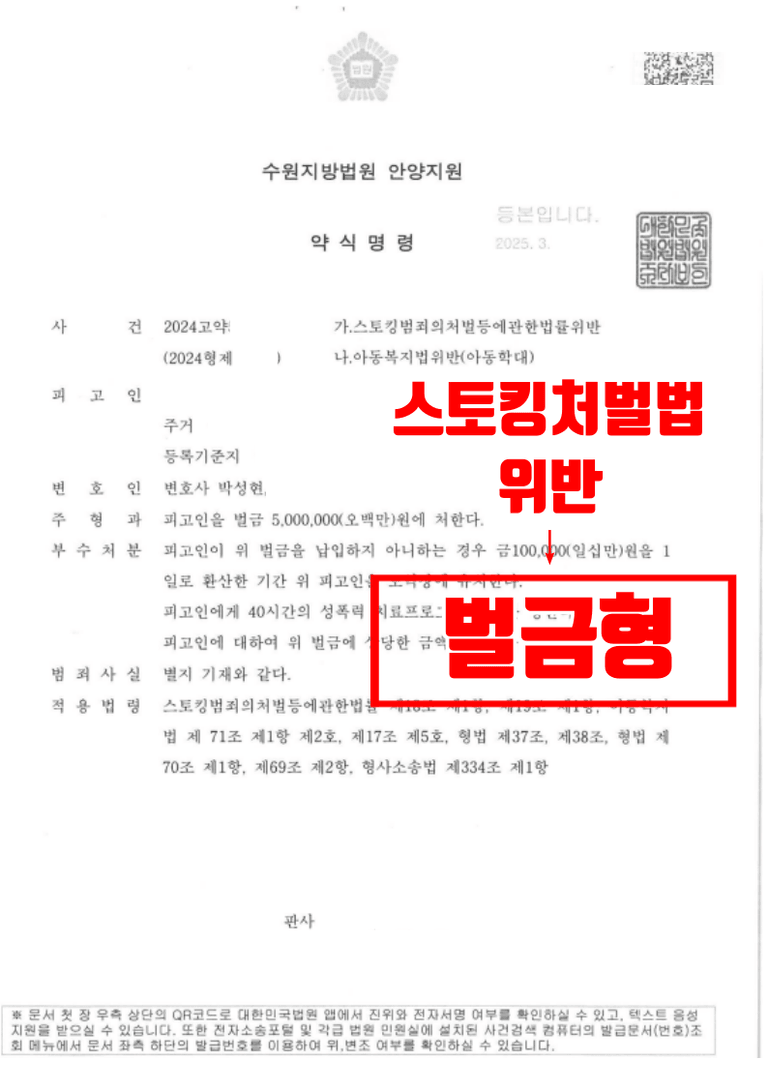 수원지방검찰청 안양지청의 검사는 법률사무소 유(唯)의 형사전문변호사가 제출한 변호인의견서의 내용을 받아들여 의뢰인을 약식기소하였고, 수원지방법원 안양지원 약식계는 의뢰인에게 벌금 500만 원을 가납할 것을 명하였습니다.