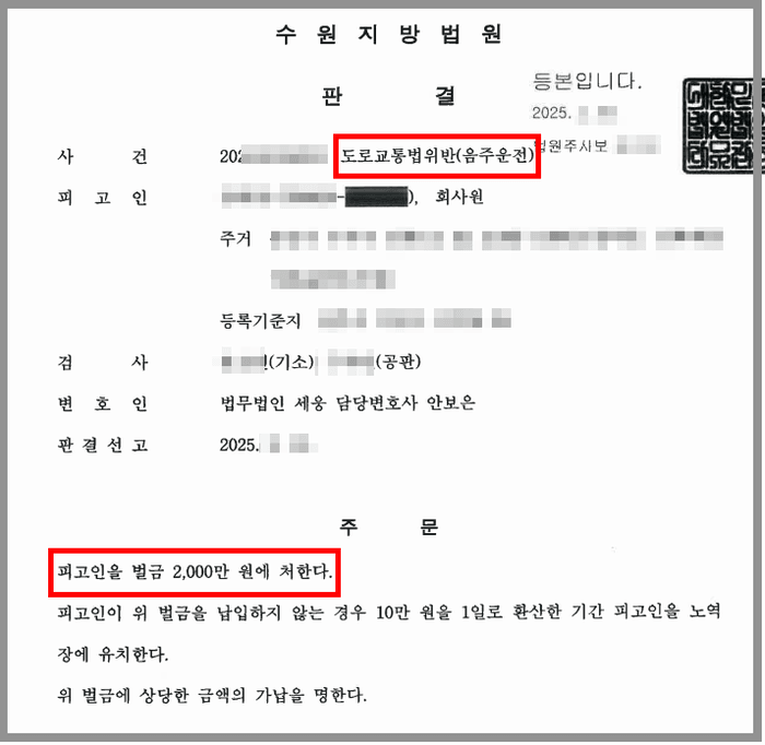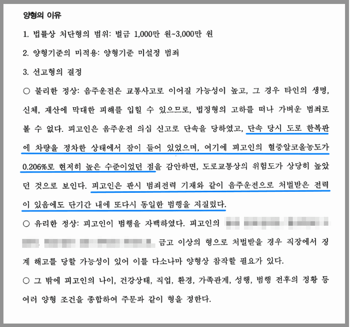 법원에서는 의뢰인의 혈중알코올농도가 높은 점 등 좋지 않은 죄질을 지적하면서도 변호인의 변론을 충분히 고려하여 의뢰인에게 벌금형의 선처를 하여주었습니다.